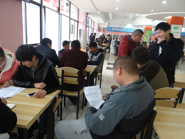 食堂的餐桌上被各種材料所覆蓋,盡管食堂中的噪音不小,有廚房炒菜的聲音,也有員工就餐時(shí)聊天的聲音,可是絲毫影響不了備考員工的熱情。一些員工一邊吃飯一邊看書,還有的正在念念有詞地背書。