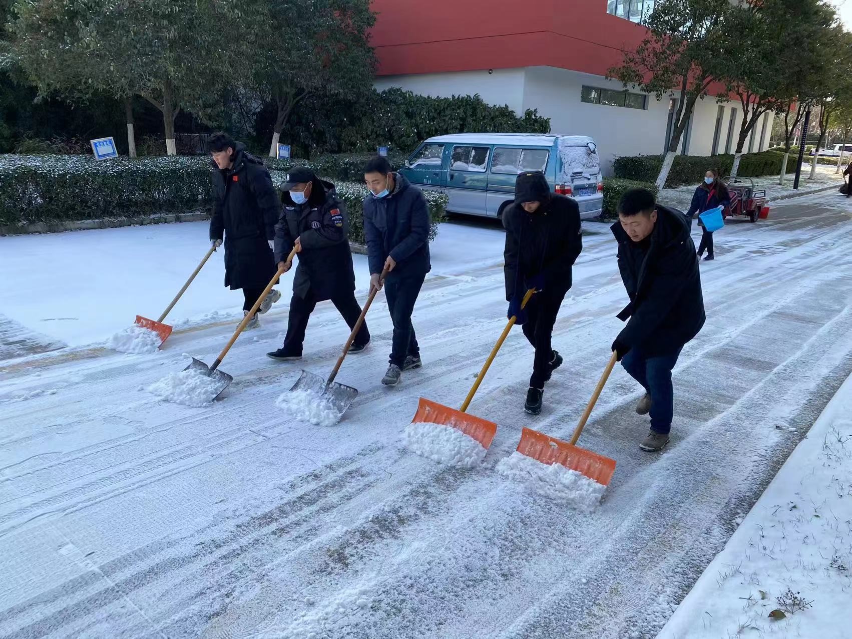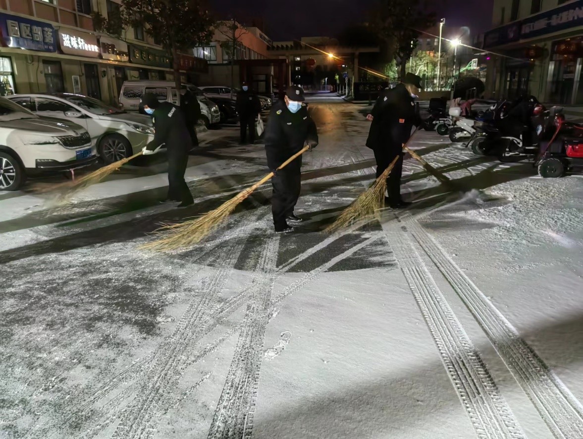 由于夜間雪情,道路積雪結(jié)冰,14日夜間,公司啟動(dòng)應(yīng)急預(yù)案,調(diào)集現(xiàn)場(chǎng)人員,利用掃把、鐵鍬針對(duì)各道口、坡道及主要行人路段開展作業(yè),確保各項(xiàng)目道路通行順暢。