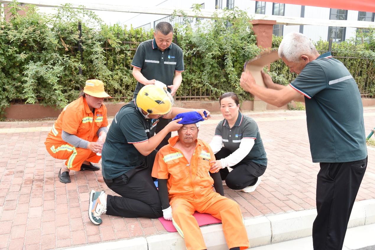 此次演練模擬鏡泊湖路一名環(huán)衛(wèi)工人在作業(yè)過程中,突然感到頭暈、心慌乏力,立即向主管人員電話求助。主管人員隨即趕到現(xiàn)場查看情況,發(fā)現(xiàn)環(huán)衛(wèi)工人躺坐在現(xiàn)場,面色潮紅、大汗淋漓,精神狀況不佳,系中暑跡象,立即向項目經(jīng)理報告,聯(lián)系應(yīng)急救援人員,并呼喊附近作業(yè)人員將其攙扶到陰涼處,解開衣扣散熱,應(yīng)急救援人員趕到現(xiàn)場后,立即用濕毛巾、酒精棉擦拭身體,涂上清涼油,喂服藿香正氣水、淡鹽水......,經(jīng)過初步救護(hù),中暑人員癥狀得以緩解后,隨即將其送往園區(qū)社區(qū)衛(wèi)生服務(wù)中心進(jìn)一步治療。