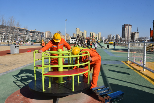 在公園廣場(chǎng)里,秩序井然,工作人員一絲不茍地對(duì)游樂(lè)健身設(shè)施進(jìn)行全方位檢查,“不遺漏”任何一顆螺絲、一根繩子,確保設(shè)施安全運(yùn)行,讓市民游客過(guò)一個(gè)“放心年”。
