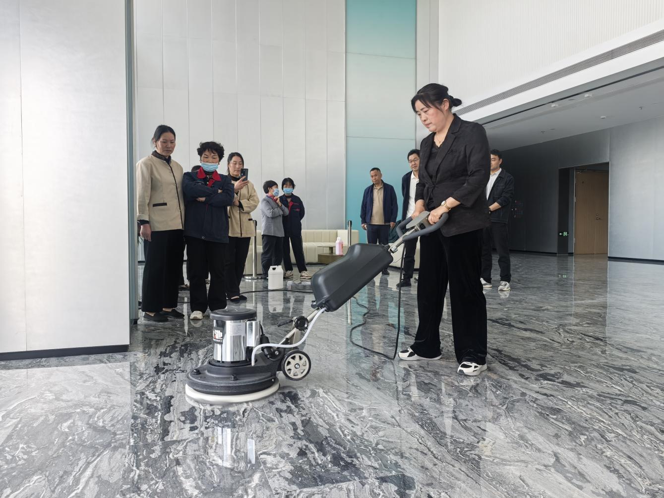 培訓圍繞辦公大樓地面清掃、電梯轎廂清潔保養(yǎng)、玻璃幕墻清洗維護、會議室、茶水間及衛(wèi)生間細節(jié)處理到外圍路面和綠化區(qū)域的日常清理管養(yǎng)等內(nèi)容,通過觀看視頻和現(xiàn)場演示方式,詳細講解了操作規(guī)范和作業(yè)標準,確保保潔人員能夠熟練掌握高效、科學的清潔技巧,提高工作質(zhì)量與效率。