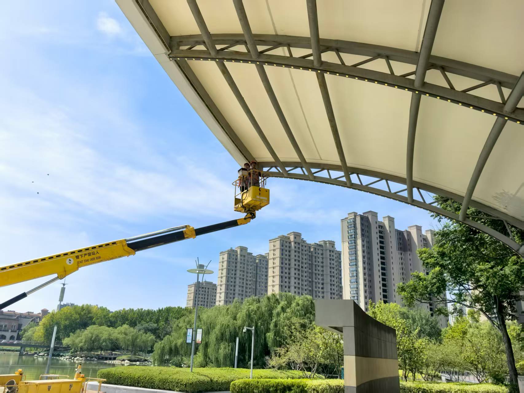“今天在蘇州公園大舞臺進行登高作業(yè),維修頂部燈光。注意作業(yè)平臺與頂棚保持安全距離……”8月20日上午9點,夏日驕陽似火,蘇州公園作業(yè)現(xiàn)場氣溫已接近37℃。園區(qū)機電維護項目部技術(shù)負責(zé)人沈剛強和同事們開始了當(dāng)天的第一場高空維修。