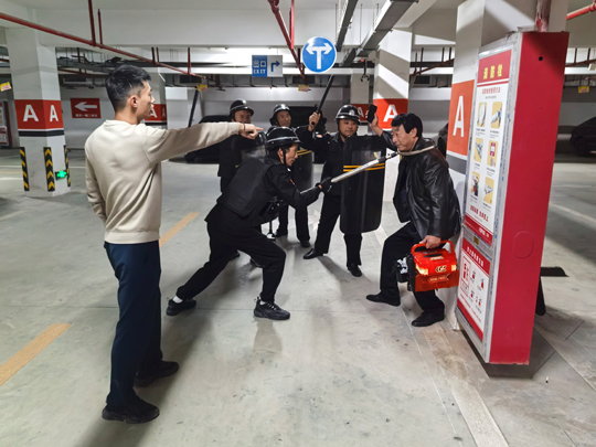 與此同時(shí),應(yīng)急處置崗隊(duì)員也攜帶防暴盾牌、橡膠棍等專業(yè)器械火速集結(jié),以最快速度抵達(dá)地下車庫(kù)指定區(qū)域。面對(duì)負(fù)隅頑抗的 “盜竊分子”,隊(duì)員們沉著冷靜,憑借日常訓(xùn)練形成的默契配合,迅速結(jié)成戰(zhàn)術(shù)小組,從不同方向?qū)?“盜竊分子” 實(shí)施包圍,果斷出擊、動(dòng)作規(guī)范,僅用數(shù)分鐘便成功將其治服,并移送公安機(jī)關(guān)處理。