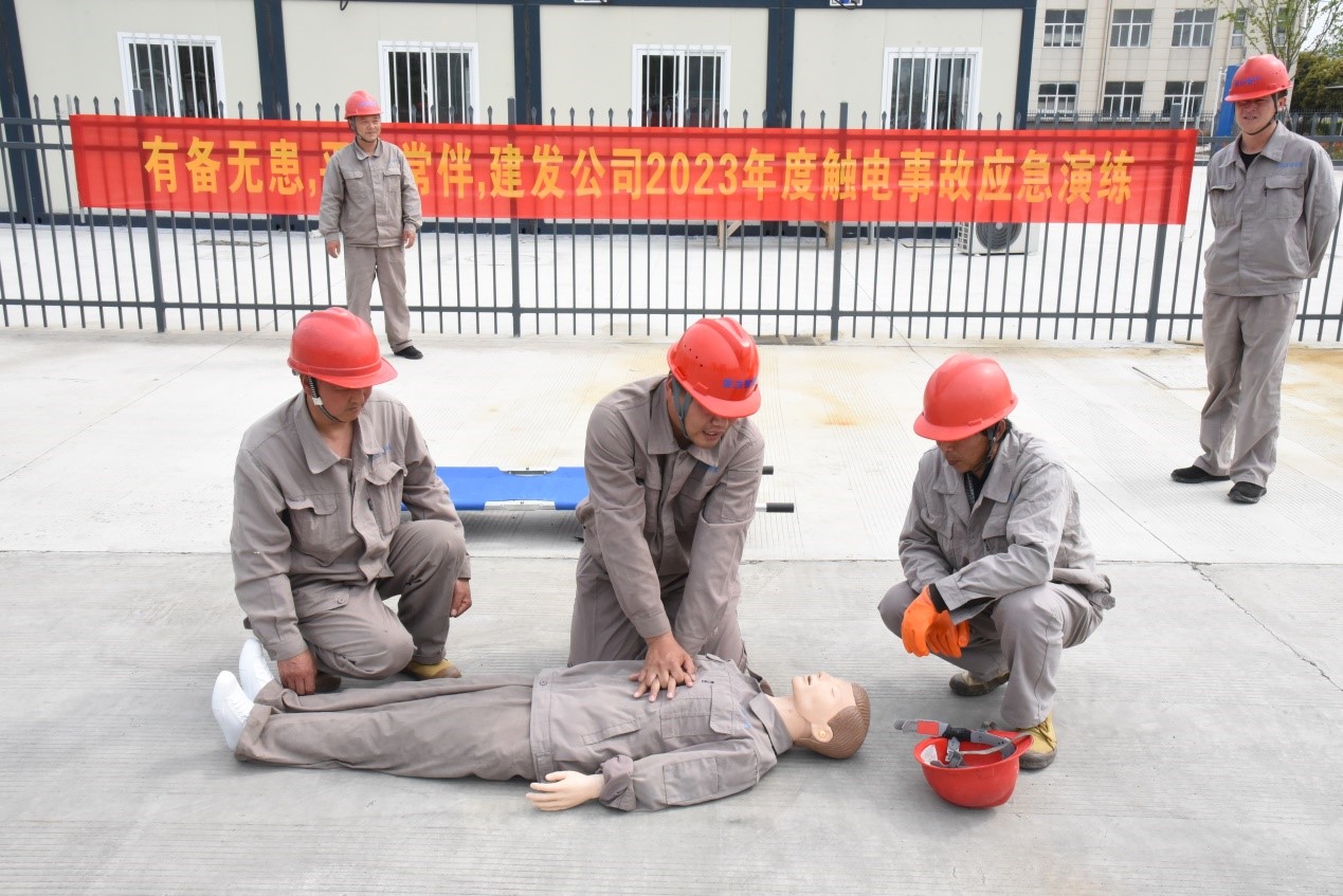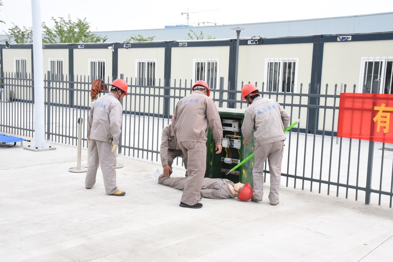 本次演練主要目的是熟悉人身觸電事故處理的流程,演練的重點(diǎn)突出在人身觸電后要及時(shí)斷開電源避免造成二次傷害和及時(shí)進(jìn)行現(xiàn)場(chǎng)急救等措施。演練以路燈維修人員在進(jìn)行配電柜內(nèi)部清潔時(shí)誤碰帶電部位發(fā)生人身觸電為主線,貫穿了從事故發(fā)生、現(xiàn)場(chǎng)救援、事故恢復(fù)、到預(yù)案關(guān)閉全過(guò)程。事故發(fā)生后,應(yīng)急指揮小組立即發(fā)布應(yīng)急預(yù)案啟動(dòng)信號(hào),并與就近醫(yī)療服務(wù)單位聯(lián)系,派人外出接應(yīng)急救車輛;同時(shí)現(xiàn)場(chǎng)救援組迅速切斷配電柜電源,將觸電人員轉(zhuǎn)運(yùn)至安全處進(jìn)行搶救;警戒組立即疏散無(wú)關(guān)人員,設(shè)置警戒線,維持現(xiàn)場(chǎng)秩序。參演人員密切配合,相互協(xié)助,嚴(yán)格按照演練要求和現(xiàn)場(chǎng)指揮命令有條不紊開展救援行動(dòng),圓滿完成了此次演練任務(wù)。